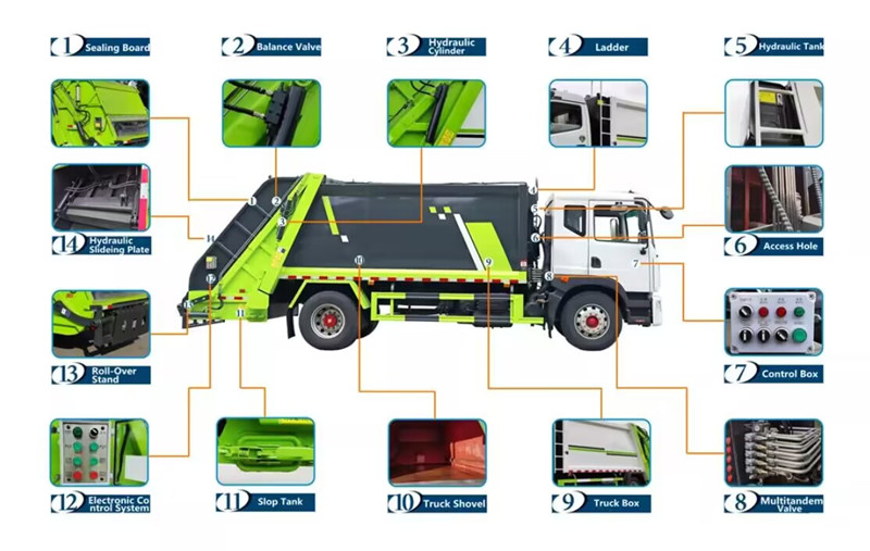 ထို နောက်ဘက် loder compactor ကိုယ်ထည် ဉာဏ်ရည်ထက်မြက်သော အီလက်ထရွန်းနစ် ထိန်းချုပ်မှုစနစ်သည် အစိတ်အပိုင်းတစ်ခုစီ၏ လုပ်ဆောင်ချက်ကို တိကျစွာ ထိန်းညှိပေးသည်။ နှစ်ထပ်ပိတ်ထားသော နောက်ဘက်တံခါးဒီဇိုင်းသည် ယိုစိမ့်မှုကို လုံးဝဖယ်ရှားပေးသည်။ အလုံးစုံဖွဲ့စည်းပုံကို တင်းကြပ်စွာ စမ်းသပ်ထားပြီး တာရှည်ခံမှုနှင့် ယုံကြည်စိတ်ချရမှု နှစ်မျိုးလုံးကို သေချာစေပြီး ထိရောက်သော သန့်ရှင်းရေးလုပ်ငန်းများအတွက် ခိုင်မာသော အထောက်အပံ့ကို ပေးစွမ်းသည်။
