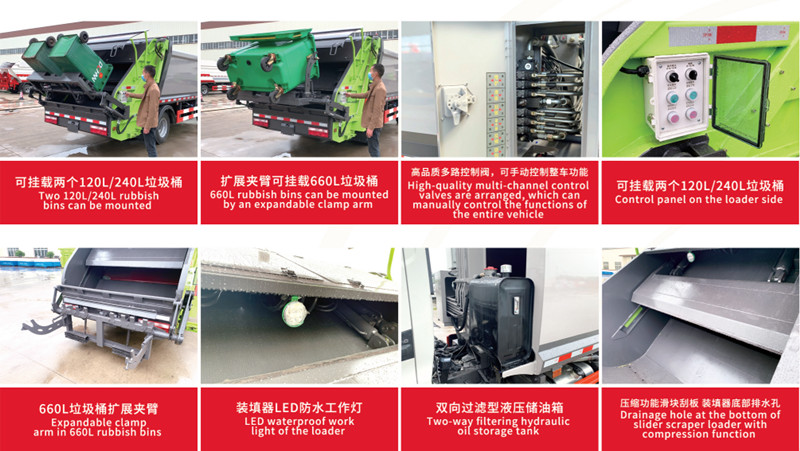 ●မြင့်မားသောစွမ်းဆောင်ရည်ရှိသောဖိသိပ်မှု- ဟိုက်ဒရောလစ်စနစ်ကို အသုံးပြုသောကြောင့် အညစ်အကြေးတင်ဆောင်နိုင်စွမ်းကို သိသိသာသာ မြှင့်တင်ပေးပါသည်။