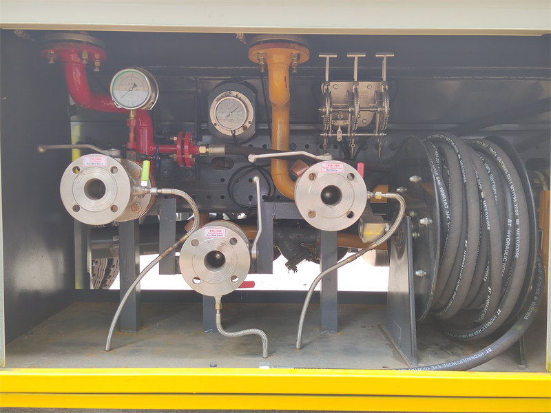 အထက်ပိုင်းဖွဲ့စည်းပုံမှာ HOWO LPG တိုင်ကီထရပ်ကား ဖိအား/အပူချိန်တိုင်းကိရိယာ၊ အရေးပေါ်ပိတ်အဆို့ရှင်နှင့် ဘေးကင်းရေးအဆို့ရှင်နှစ်ခုပါဝင်သော ဉာဏ်ရည်ထက်မြက်သော ဘေးကင်းရေးစနစ်နှင့် ပေါင်းစပ်ထားသည်။ အလွန်အမင်းအခြေအနေများတွင် တည်ငြိမ်မှုရှိစေရန်အတွက် တိုင်ကီကို တင်းကျပ်သော ဂဟေဆက်စစ်ဆေးမှုများနှင့် အပူချိန်နိမ့်ကျုံ့နှုန်းထိန်းချုပ်မှုကို ဖြတ်သန်းသည်။ ယာဉ်တွင် -၄၀°C မှ ၅၀°C အထိ အပူချိန်တွင် လည်ပတ်မှုကို ပံ့ပိုးပေးသည့် ၁၅ ကုဗမီတာ/နာရီ ကာဗွန်သံမဏိပန့်နှင့် ၂ လက်မ စီးဆင်းမှုမီတာတို့ တပ်ဆင်ထားသည်။ ရွေးချယ်နိုင်သော ပုံစံများတွင် ပြည်ပမှတင်သွင်းသော အငွေ့ပျံစက်နှင့် လက်မှတ်ပုံနှိပ်ခြင်းပါရှိသော မီတာစနစ်တို့ ပါဝင်သည်။ မီတာ ၁၅ ရှည်သော တင်/ချပိုက်နှင့် အပြည့်အဝပိတ်ထားသော လွှဲပြောင်းစနစ်တို့ တပ်ဆင်ထားသောကြောင့် မြင့်မားသောဖိအားရှိသော သင်္ဘောများအတွက် နိုင်ငံတကာဘေးကင်းရေးစံနှုန်းများနှင့် အပြည့်အဝကိုက်ညီသော LPG သယ်ယူပို့ဆောင်ရေးကို ထိရောက်ပြီး ဘေးကင်းစေသည်။