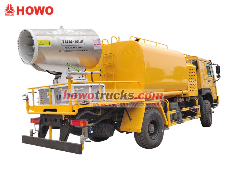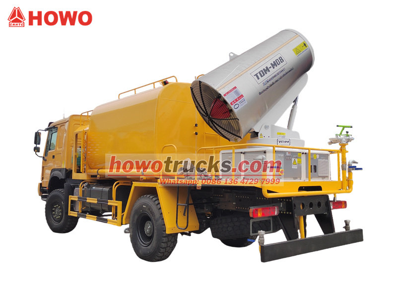 ထို HOWO 4×4 ရေအမြောက်ထရပ်ကား မီတာ ၈၀ အလွန်ရှည်လျားသော ရေပိုက်နှင့် မြင့်မားသောဖိအားဖြင့် ရေဖြန်းစနစ်တို့ ပေါင်းစပ်ထားသည်။ အဆိုပါအမြောက်တွင် နော်ဇယ် ၉၀ တပ်ဆင်ထားပြီး ရေမှုန်ငယ်များ (၂၀-၂၀၀ မိုက်ခရိုမီတာ) ကို ၂၀,၀၀၀ စတုရန်းမီတာအထိ လွှမ်းခြုံနိုင်ပြီး ဖုန်မှုန့်များကို ထိရောက်စွာ နှိမ်နင်းနိုင်သည်။ ၁၀,၀၀၀ လီတာဆံ့ ကာဗွန်သံမဏိရေတိုင်ကီကို ၆၀ မီတာ/နာရီ ရေစီးဆင်းမှုစုပ်စက်နှင့် ပေါင်းစပ်ထားပြီး လမ်းသန့်ရှင်းရေး၊ လမ်းဖုန်မှုန့်လျှော့ချရေးနှင့် စိုက်ပျိုးရေးဆေးဖြန်းခြင်းကဲ့သို့သော အခြေအနေအမျိုးမျိုးအတွက် အသုံးချမှုများကို ပံ့ပိုးပေးသည်။ ကြိုးမဲ့အဝေးထိန်းစနစ်နှင့် touchscreen လည်ပတ်မှုစနစ်နှစ်မျိုးလုံးဖြင့် ပြောင်းလွယ်ပြင်လွယ်ကိုင်တွယ်မှုကို ပေးစွမ်းသောကြောင့် သတ္တုတွင်းဒေသများ၊ ဆိပ်ကမ်းများ၊ မြို့ပြအရေးပေါ်အခြေအနေများနှင့် အခြားနယ်ပယ်များအတွက် ဘက်စုံဖြေရှင်းချက်တစ်ခုဖြစ်စေသည်။