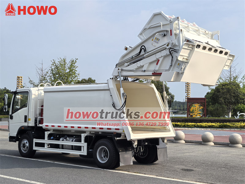 တရုတ်နိုင်ငံထုတ် Sinotruk HOWO နောက်ဘက်တင်ကားသည် HOWO 4×2 အပေါ့စားထရပ်ကားကိုယ်ထည်ပေါ်တွင် တည်ဆောက်ထားသော ပရော်ဖက်ရှင်နယ် အမှိုက်သိမ်းယာဉ်တစ်စီးဖြစ်ပြီး WEICHAI WP2.3NQ130E50 မော်ဒယ် 130HP၊ Euro 5P ဒီဇယ်အင်ဂျင်နှင့် 6F နှင့် 1R ပါရှိသော WLY manual gearbox တပ်ဆင်ထားသည်။ HOWO 8000L အမှိုက်ကြိတ်စက် အမှိုက်သိမ်းကားတွင် 8cbm compactor tanker ကိုယ်ထည်တပ်ဆင်ထားပြီး အားလုံးသည် နိုင်ငံတကာ St52 ပစ္စည်းကို အခြေခံထားပြီး Q355 ပစ္စည်းနှင့်ညီမျှကာ ဘေးနှင့်ကြမ်းပြင်အတွက် အထူ 4mm ရှိသည်။ အဆင်ပြေစွာအလုပ်လုပ်ရန်အတွက် hydraulic အပြည့်အဝအလုပ်လုပ်သည့်ကိရိယာ။ push plate၊ နောက်ဘက် tailgate၊ slide plate၊ scraper၊ နောက်ဘက် tilting device အတွက် hydraulic cylinder ပါရှိသည်။ လွယ်ကူစွာလည်ပတ်နိုင်ရန် CAN-BUS control device နှင့်လည်း တွဲဖက်အသုံးပြုထားသည်။