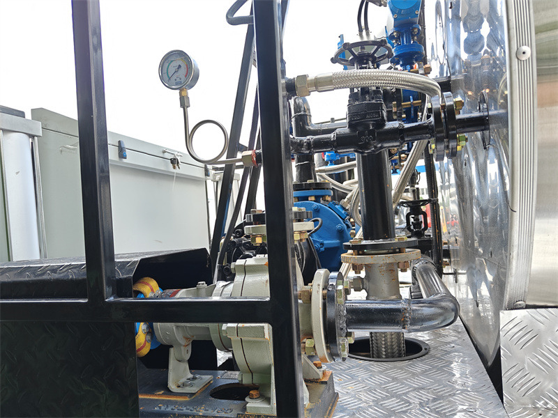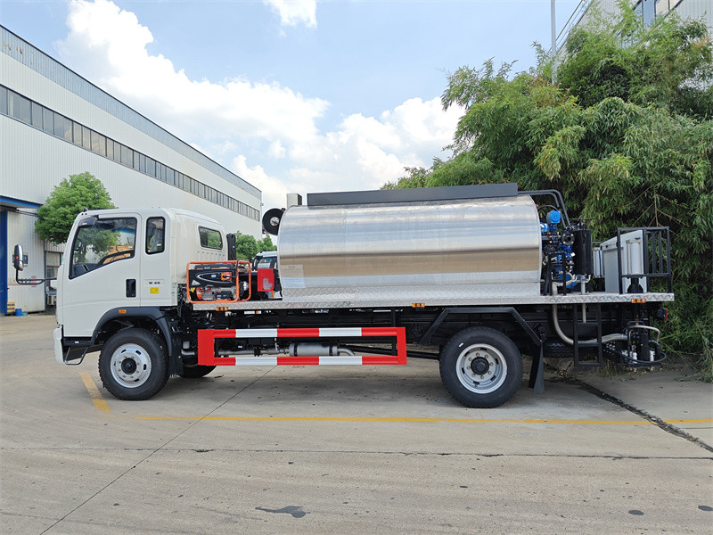 Howo 4x2 5cbm ကတ္တရာဖြန့်ဖြူးရေးထရပ်ကားကို Howo 2080 single-row cab chassis မှ ပြုပြင်မွမ်းမံထားပြီး 3800mm wheelbase ပါရှိသည်။ ၎င်းတွင် YN4102QBZL အင်ဂျင်နှင့် WLY6TS55C gearbox တပ်ဆင်ထားသည်။ အပေါ်ထပ်ဖွဲ့စည်းပုံတွင် 5 cubic meter ကတ္တရာကန်၊ smart RY40-25-160 ကတ္တရာအပူစုပ်စက်နှင့် နောက်ဘက်တွင် ကတ္တရာ nozzle ၂၈ ခုပါဝင်ပြီး ဖြန်းပက်အကျယ် ၄ မီတာနှင့် ဖြန်းနှုန်း 0.20-1.5L/ ရှိသည်။㎡၎င်းတွင် အီတလီမှတင်သွင်းသော Riello G10 လောင်စာဆီအပူပေးစနစ်၊ ကားအတွင်း ဉာဏ်ရည်ထက်မြက်သော ကွန်ပျူတာထိန်းချုပ်မှုနှင့် အရန်ဂျင်နရေတာအစုံတစ်ခု ပါရှိသည်။