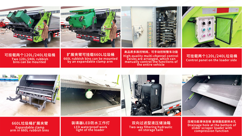 ●မြင့်မားသောစွမ်းဆောင်ရည်ရှိသောဖိသိပ်မှု- ဟိုက်ဒရောလစ်စနစ် တပ်ဆင်ထားသောကြောင့် ၎င်းသည် စွန့်ပစ်ပစ္စည်းပမာဏကို သိသိသာသာ ဖိသိပ်နိုင်ပြီး ဝန်တစ်ခုလျှင် တင်ဆောင်သည့်ပမာဏကို တိုးမြှင့်ပေးကာ သယ်ယူပို့ဆောင်သည့်ကြိမ်နှုန်းကို လျှော့ချပေးပါသည်။